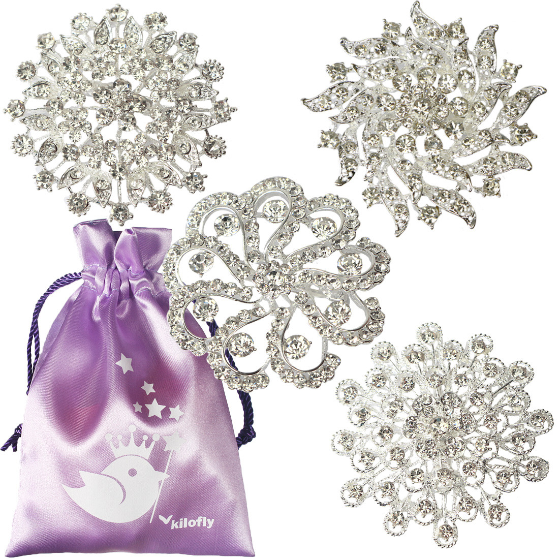 This set includes 4 kilofly Rhinestone Crystal Brooches with a nice drawstring pouch.