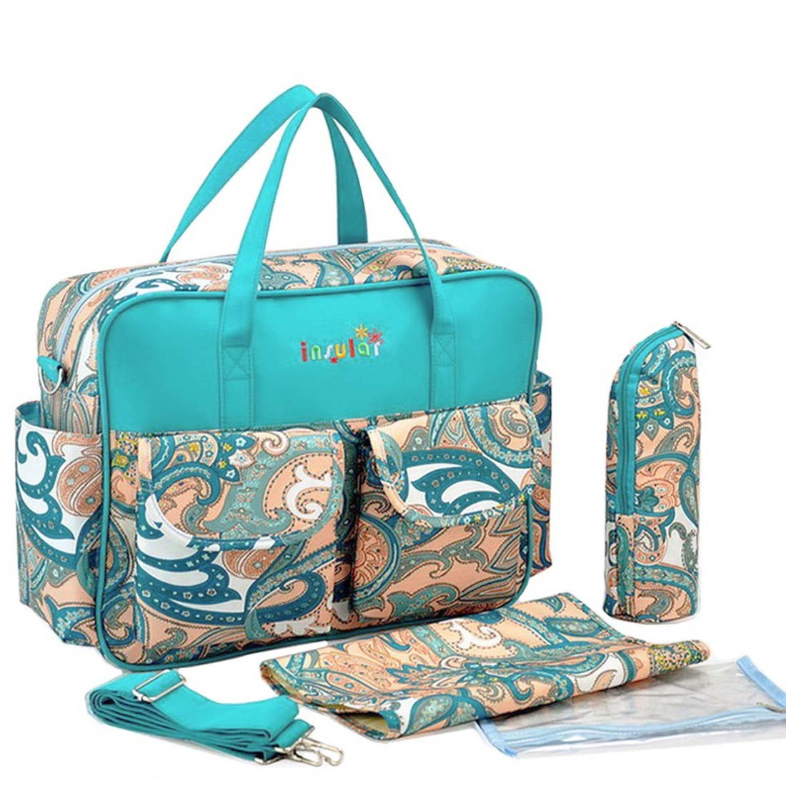 KF Baby Rox Diaper Bag is great for a full day out or a short walk under the sun. This value set includes a large top zip tote to handle all of mom's and baby's needs for a full day out. A spacious interior with lots of room, numerous interior pockets for easy access to bottles, diapers and more. While you can carry the bag on your shoulder with the top handles, you can also choose to carry it as a crossbody bag using the strap that comes along in the set. This value set includes 5 items: a large diaper bag, a crossbody bag strap, an insulated bottle holder, a diaper changer pad, and a small clear pouch for you to keep small items organized.